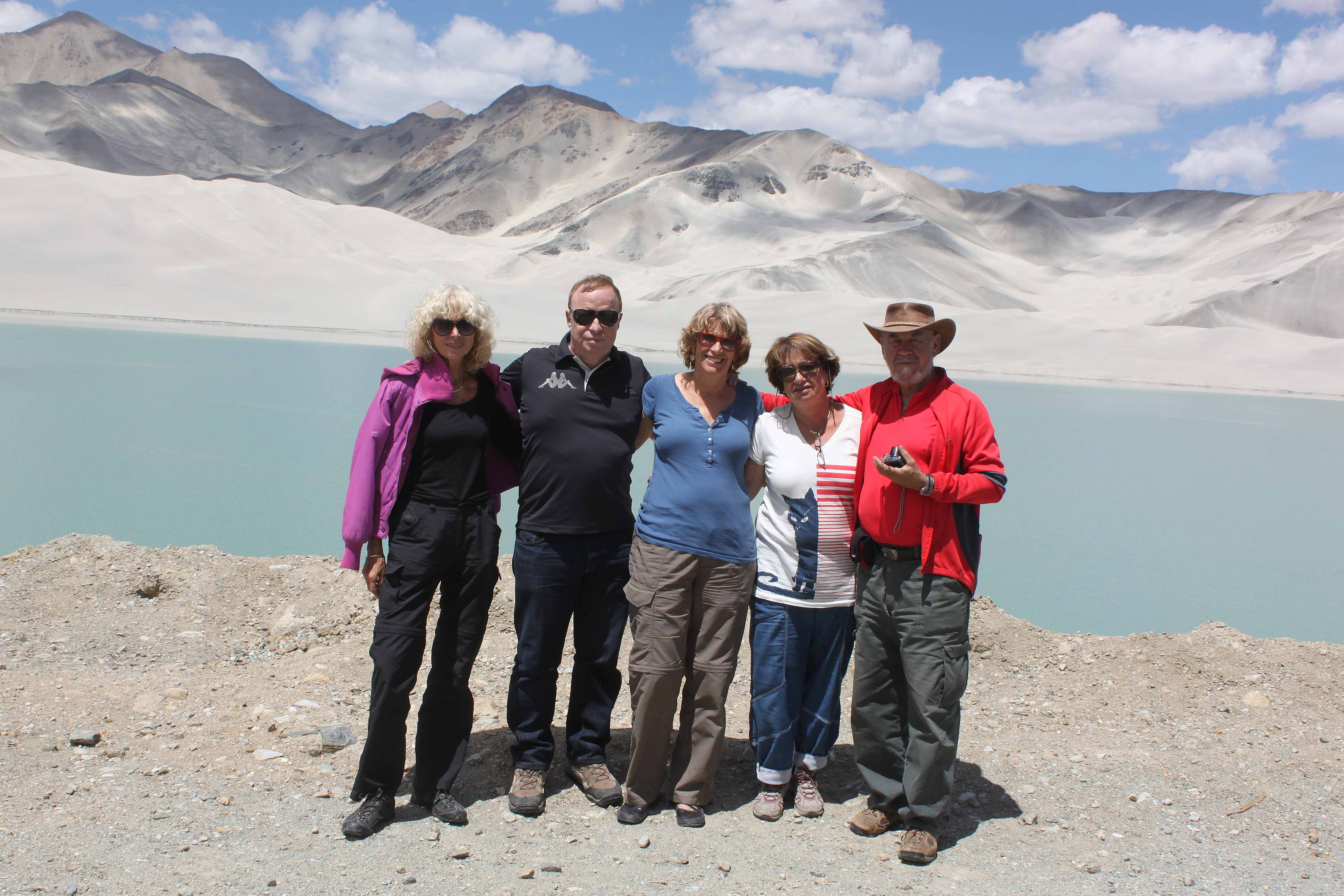 * בדרך, אגם הקרא-קול (כחול וברקע הרים בהירים ופסגות מושלגות) , תצפיות לפסגות ה Mutztagata ו- Kongur פסגות המתמשאים ל 7,650 מטר. עברנו מעבר הרים שגובהו כ- 4000 מטר.
